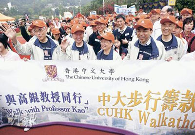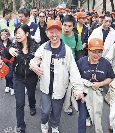 中大14日舉行“與高錕教授同行”籌款日,開步禮除了有高錕伉儷為主角外,中大多名重量級(jí)人士,包括校董會(huì)主席鄭海泉、兩位前任校長馬臨及金耀基也有參加,現(xiàn)任校長劉遵義也與新婚太太麥嘉軒十指緊扣一同步行。