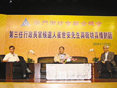 中新網(wǎng)7月13日電 據(jù)香港《文匯報(bào)》報(bào)道,澳門行政長官唯一候選人崔世安發(fā)表參選政綱后,隨即到各大社團(tuán)介紹政綱。12日他到澳門街坊會(huì)聯(lián)合總會(huì),向逾400位街坊推介政綱兼真情對(duì)話。