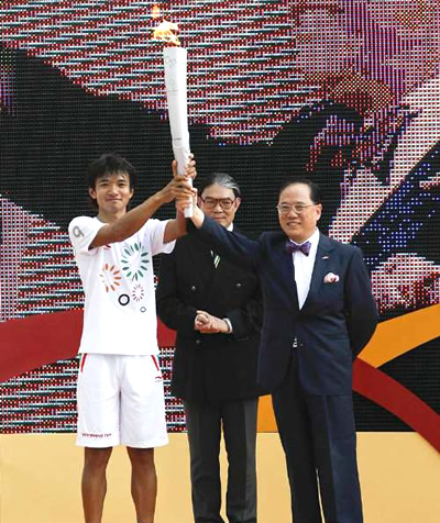 八月二十九日,東亞運(yùn)火炬接力跑在香港順利舉行,港協(xié)暨奧運(yùn)會(huì)會(huì)長(zhǎng)霍震霆、民政事務(wù)局局長(zhǎng)曾德成、政制及內(nèi)地事務(wù)局局長(zhǎng)林瑞麟、民政事務(wù)局常任秘書長(zhǎng)尤曾嘉麗等官員,及六十五名火炬接力手在灣仔金紫荊廣場(chǎng)舉行火炬跑閉幕儀式。 中新社發(fā) 鄧慶樂 攝