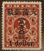 這枚紅色印花郵票是清朝人用作繳交關(guān)稅的三分稅票,但國家郵政成立初期未有足夠郵票使用,在稅票蓋上一元,當作郵票。