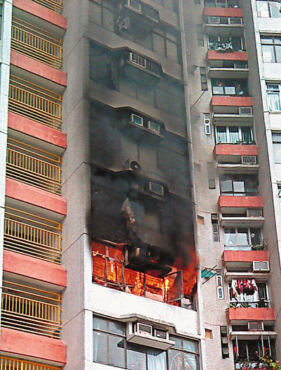 火警現(xiàn)場為牛頭角彩霞村彩月樓4樓一住宅單位,女戶主姓周(59歲),21日中午偕兒子外出,至下午2時(shí)08分,單位突閉門失火,未幾全屋均陷火海,火舌及濃煙由窗口涌出上升。樓上2層單位首當(dāng)其沖,窗戶及外墻嚴(yán)重熏黑,逾200名居民慌忙逃生,情況混亂。住在樓上11樓一名老翁企圖拉出走廊消防喉救火,卻發(fā)現(xiàn)水喉無水,徒勞無功,事后經(jīng)了解相信消防系統(tǒng)正常,只是他緊張關(guān)頭不懂使用消防喉。
