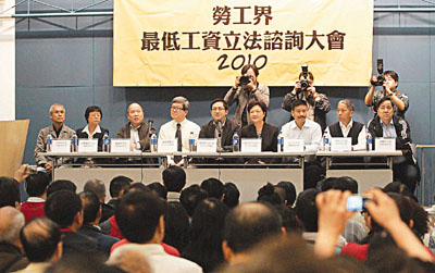 中新網(wǎng)4月27日電 據(jù)香港《文匯報》報道,港府正就香港首個最低工資水平收集各界意見。來自工聯(lián)會、勞聯(lián)及職工盟的勞工界昨日號召逾500人參與“武林大會”,討論最低工資最新形勢,與會人士的主流意見傾向?qū)⒆畹凸べY水平訂為時薪33至35元(港幣 下同),但亦有工會只要求訂為27元,故仍需待問卷調(diào)查完成統(tǒng)計后,才能定出一個代表勞工界的最低工資水平,估計約一星期后有結(jié)果。