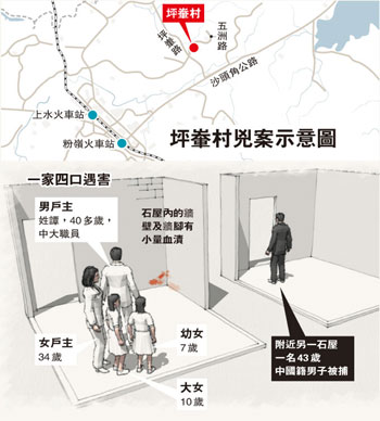 2時(shí)許,同事趕到坪輋村譚家時(shí),發(fā)現(xiàn)一名可疑男子在石屋前泥地掘坑有所動(dòng)作,感覺不妙,于是立即報(bào)警。其間疑人發(fā)現(xiàn)行藏?cái)÷,立即跑到附近一間村屋匿藏。警員接報(bào)馳至,發(fā)現(xiàn)泥地上有可疑血漬,立即召消防到場(chǎng)協(xié)助,消防員將泥土的表層翻開,見2具男女大人,以及2具女童的尸體,由于4名死者已無生命跡象,警方立即封鎖現(xiàn)場(chǎng),以待7日進(jìn)一步挖掘調(diào)查。