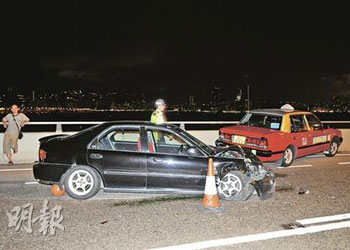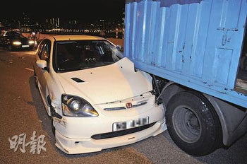 逾20輛經(jīng)改裝的私家車,13日凌晨在被視為香港熱門非法賽車“跑道”之一的觀塘繞道,以160公里時速狂飆。警方接報趕至,并事先在繞道上截停5輛普通市民的車輛,作為堵截非法賽車的路障。未幾,10多輛跑車陸續(xù)高速馳駛沖過防線,另有最少3車實時掉頭逆線逃去,而5輛被充作“人肉路障”的汽車頓成犧牲品全被撞毀。有挨撞的士司機不滿警方做法,即場指斥“沒有理由要我們充當(dāng)‘人肉沙包’!”。