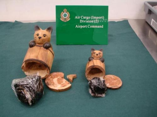 案情透露,海關(guān)機(jī)場(chǎng)科人員于9月27日清晨檢驗(yàn)五件由清邁經(jīng)香港轉(zhuǎn)運(yùn)到加州,報(bào)稱“木制工藝品”的紙箱包裹。關(guān)員利用X光檢查后,發(fā)現(xiàn)箱內(nèi)物品可疑,并開箱割開多件“木制貓”雕刻品檢驗(yàn),發(fā)現(xiàn)內(nèi)里藏有用膠袋包裝的熟鴉片,共重約29公斤。