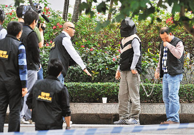 其中一名疑犯黑布蒙頭,腰間綁上鐵鏈,在灣仔區(qū)域法院對(duì)面重組案情。有組織罪案及三合會(huì)調(diào)查科探員在場(chǎng)調(diào)查,封鎖大廈出入口和附近行人路,并拍下整個(gè)過(guò)程。疑犯講述案發(fā)經(jīng)過(guò)。
