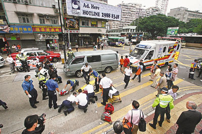 另外,一對(duì)來(lái)港探親、上了年紀(jì)的內(nèi)地姐弟,昨天上午11時(shí)45分在旺角染布房街近亞皆老街交通燈路口橫過(guò)南行線馬路時(shí),1輛沿亞皆老街東行客貨車(chē)右轉(zhuǎn)入染布房街,弟及時(shí)閃避, 68歲陸姓老婦卻被客貨車(chē)撞個(gè)正著,當(dāng)場(chǎng)飛彈數(shù)呎倒地,頭破血流昏迷,送院情況危殆。肇事客貨車(chē)黃姓30歲司機(jī)事后在場(chǎng)助查,警方正調(diào)查是否有人不遵照交通燈號(hào)導(dǎo)致意外。