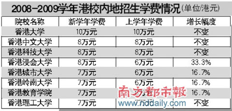 香港浸會大學內(nèi)地本科生學費從去年的6萬港元增至8萬港元,增加超過三成。而香港教育學院、香港嶺南大學的學費標準也由每年6萬港元升到7萬港元。目前已經(jīng)公布今年內(nèi)地招生計劃的高校中,也有高校的收費標準維持不變,如香港大學、香港中文大學、香港科技大學、香港理工大學。但是,香港大學將內(nèi)地生預(yù)繳費用從1.5萬港元增至3萬港元。