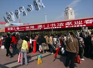 3日下午在口岸廣場(chǎng)和暖的陽(yáng)光下,兩地書(shū)法家們對(duì)著一條拼成近20米長(zhǎng)的長(zhǎng)桌大筆潑墨,一幅幅飽蘸金粉的春聯(lián)將春節(jié)漸近的氣氛襯托得無(wú)比濃烈。為方便旅客,每個(gè)書(shū)法家面前都備有一份包括數(shù)百幅春聯(lián)的數(shù)據(jù),索要者選中任何一幅,書(shū)法家立即現(xiàn)場(chǎng)揮毫題寫(xiě),使索要者立即可取。