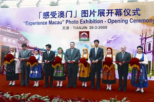 圖片展30日上午9時半在天津博物館開幕,澳門社會文化司司長崔世安,中聯(lián)辦經(jīng)濟部長周志奎,旅游局長安棟梁,天津市旅游局副局長金鐵林、佟景正等主持開幕儀式。圖片展為期1周,展出20多幅充滿澳門特色的圖片。