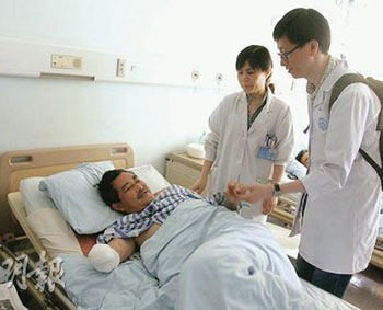 臥在病床上的賈大夫,破爛的腸臟已縫補(bǔ)好,情況穩(wěn)定過(guò)來(lái),但因雙臂和盆骨都折斷,動(dòng)也不能動(dòng),深切體會(huì)能醫(yī)不自醫(yī)的無(wú)奈。他坦言,若不是身受創(chuàng)傷,他應(yīng)是在災(zāi)場(chǎng)上救援的一員,但目前只能等待由香港到來(lái)的醫(yī)生為他動(dòng)手術(shù)。“真的很感謝香港醫(yī)生愿意前來(lái)幫忙……很有心……”
