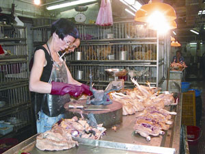 圖:澳門街市雞販戴手套操作,注重清潔衛(wèi)生。(圖片來源:澳門日報)