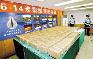 今年6月4日,經過近一年的艱苦偵查,在公安部、廣東省公安廳禁毒局的指導協(xié)調下,在黃埔海關、安全等部門以及香港、澳門、廣東省有關地市警方的協(xié)助下,廣州市公安局成功破獲公安部督辦的“6·14”特大跨國走私可卡因案, 先后抓獲9名犯罪嫌疑人(其中兩名為外籍犯罪嫌疑人),繳獲毒品可卡因共約530千克及作案汽車3輛,成功切斷了一條從南美洲到中國的可卡因運輸線。