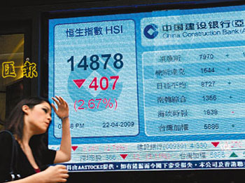 中新網(wǎng)4月23日電 據(jù)香港《文匯報》報道,港股經(jīng)周二轉(zhuǎn)勢后,22日繼續(xù)下跌,終跌破15000點。大市在上午曾一度上升,但午后內(nèi)地上證綜指急插水3%,拖累港股表現(xiàn),淡友趁勢發(fā)惡,午市大插400點的頹勢,相信嚇怕不少散戶,尤其下午開市首15分鐘便挫近260點。恒指收報14878點,跌407點,跌幅2.7%。
