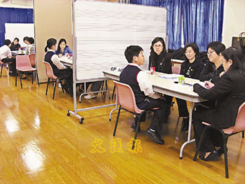 中新網(wǎng)1月14日電 升中學面試對香港小學生而言,有著舉足輕重的影響,故有小學日前舉行大型模擬面試,約50名高小學生家長搖身變成威嚴十足的面試官,以流利的兩文三語考核學生,協(xié)助近170名小六生預演氣氛緊張的升中面試。有學生早在1周前已認真準備,把握練習機會,全力爭取入讀心儀英文中學的機會。
