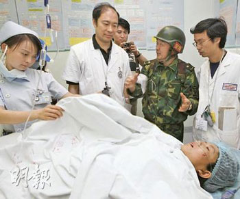 中新網(wǎng)5月22日電 據(jù)香港明報報道,“我吃野草、吃蚯蚓,我告訴自己要活下去,拼命的活下去!口喝了,沒有水,我便喝自己的尿,喝了兩三遍……不知過了多少天,劉大爺來到,他說:‘我是來救你的!’”21日再有一名在廢墟中重傷待援9日9夜的女工獲救,而負責(zé)救援的,正好是香港醫(yī)管局急癥?漆t(yī)生劉楚釗和護士劉炳發(fā)。