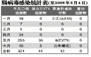 圖:腸病毒感染統(tǒng)計(jì)表(至2008年6月4日)。(圖片來(lái)源:澳門日?qǐng)?bào))