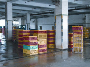 圖:工人清洗批發(fā)市場內(nèi)設(shè)施及使用過的膠籠。(圖片來源:澳門日報)