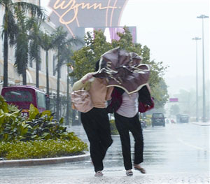 香港24日晚懸掛8號(hào)風(fēng)球,往來(lái)港澳客船全面停航,外港碼頭25日上午已滯留逾百旅客。至客船復(fù)航,場(chǎng)內(nèi)旅客有序離澳。25日天氣惡劣,強(qiáng)風(fēng)勁吹,時(shí)有傾盆大雨,即使居民帶備雨具,仍被強(qiáng)風(fēng)吹至東倒西歪、狼狽不堪,市面顯得冷清。澳門(mén)及離島多處出現(xiàn)塌樹(shù)、棚架倒塌及路陷事故,不少招牌被強(qiáng)風(fēng)吹至搖搖欲墜。