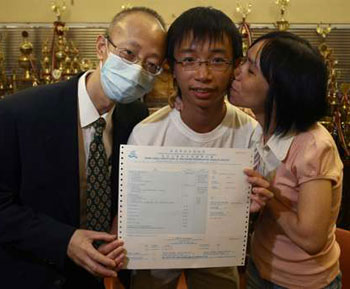 中新網8月5日電 據香港大公報報道,香港英中名校盡攬2008年中學會考的15名“十優(yōu)狀元”,九龍?zhí)晾硶撼蔀椤按筅A家”,獨占4席。最感人的狀元為皇仁書院的吳國輝,他父親不幸患上血癌,使他深深感受到患病痛苦,因而發(fā)奮讀書,立志行醫(yī)。
