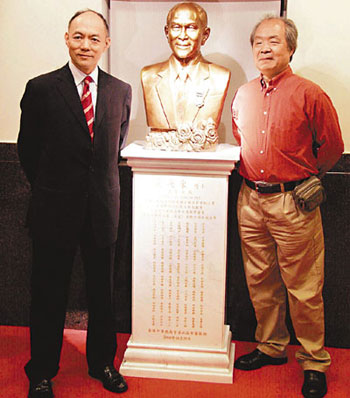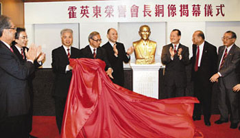 霍老次子、中總會長霍震寰偕候任會長蔡冠深、榮譽會長曾憲梓等,主持29日銅像揭幕儀式。與霍老相識多載的曾憲梓,還在霍老銅像面前作三鞠躬,表達對他的懷念。