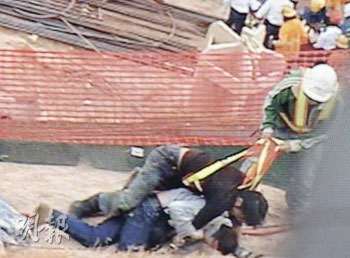 工友其后上前勸止及拉開逞兇者,衛(wèi)永康不欲被兇徒逃去,負傷企圖抓緊疑人雙腳,但不成功,兇徒再掙開工友,再向衛(wèi)連環(huán)出拳及起腳襲擊其頭部及身體,衛(wèi)永康被毆至?xí)炟省U{(diào)查工傷的警員見狀趕至才控制場面,警員調(diào)查后,把涉嫌傷人的李某拘捕帶署,但并沒有帶走涉“叉頸”的工人,衛(wèi)永康則由救護車送院救治。