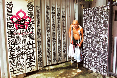 1999年“九龍皇帝”曾灶財與他的街頭書法。(葉英杰路透社)自稱“九龍皇帝”的曾灶財1921年生人,是香港著名的城市涂鴉藝術(shù)家。上世紀(jì)90年代,曾被路人發(fā)現(xiàn)于旺角街頭涂鴉,繼而被報道一舉成名,作品曾被拿到英國蘇富比拍賣行拍賣,F(xiàn)時在安老院養(yǎng)老。