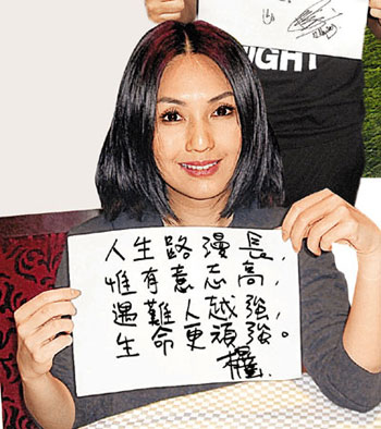 經(jīng)歷一年的恢復,千嬅贊賞政府重建災區(qū)的速度很快,像曾受災的北川或會再有余震,現(xiàn)移往新地方重建了另一個北川,好讓民眾重新開展新生活,自給自足。千嬅明白這不是一時三刻可以完全復元過來,重建項目尚要很多年才能真正成功。但令千嬅最欣慰的是:“去年到災區(qū)時,城里每個人臉上都是鎖緊愁眉,這次重臨舊地,就看到連小朋友都變得開懷了,臉上有掛上笑容,問他們的志愿,大家異口同聲說想做醫(yī)生將來去幫人,所看到的都是充滿生存的意志,這也就是中國人的特質,擁有頑強的生命力和團結一致的精神!”