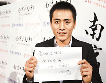 去年發(fā)生四川地震時,陸川和《南京!》的劇組人員在長春拍攝電影中,得知地震發(fā)生后,高圓圓、秦嵐以及整個劇組都有捐錢,一方有難八方支持。相隔一年,見到四川的同胞漸漸走出陰霾,“在此我希望對他們說:‘沒有什么可以阻擋我們對生命的向往,地震一周年,祝四川的同胞身體健康,快樂!’”