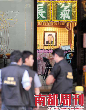 在靈堂掛著的另一副更正式的挽聯(lián)是:“劍膽無畏,永不妥協(xié)!膘`堂祭奠的死者,新義安近年最“出位”的黑道頭目,拼殺20余年的李泰龍,最終在8月4日凌晨,在自己的地盤尖沙咀,被仇家有計劃地斬殺。短短30秒的車撞、刀砍,曾經(jīng)傷人無數(shù)的他,最終血噴街頭而終,震撼香港。