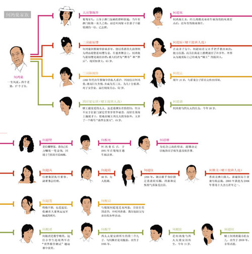 作為澳門首富,“賭王”何鴻燊及其家族控制著高達(dá)5000億港元的資產(chǎn);同時(shí),作為富人明星,何鴻燊不但被港澳坊間稱為“何大口”(對媒體說話百無禁忌),其四位太太所生的17個(gè)子女,更一直是各大報(bào)紙雜志商業(yè)、時(shí)政和娛樂版多年來的風(fēng)頭人物。
