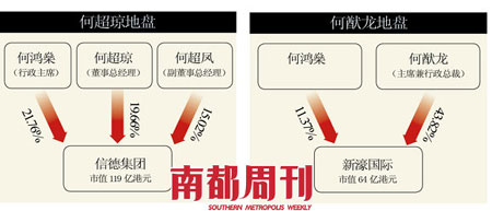 何鴻燊旗下的商業(yè)王國中,以信德集團(tuán)最為實(shí)業(yè)化,經(jīng)營房地產(chǎn)、酒店及運(yùn)輸?shù)葮I(yè)務(wù),由二太太長女何超瓊?cè)味驴偨?jīng)理,二太太三個(gè)女兒也占股權(quán)共37%,是名副其實(shí)的大股東;二太太長子何猷龍擔(dān)任董事長的新濠國際,何鴻燊所占股份也低于兒子。