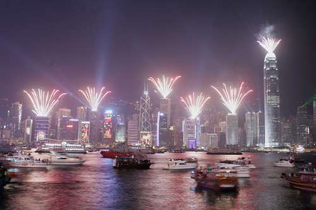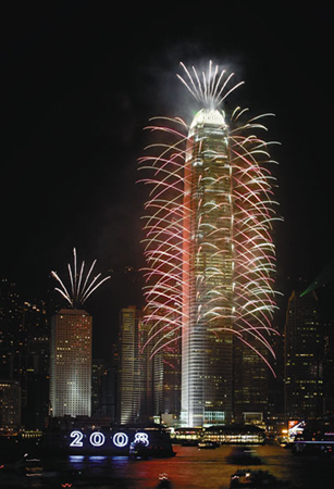二十三時(shí)五十九分,行政長(zhǎng)官曾蔭權(quán)在尖沙嘴文化中心啟動(dòng)倒計(jì)時(shí)儀式。二00七年的最后二十秒,國(guó)金二期北面外墻兩側(cè)由三十二層起依次向上燃放焰火,火樹銀花照耀整個(gè)維港;合和中心、AIG大廈、長(zhǎng)江集團(tuán)中心及東企業(yè)廣場(chǎng)四棟大廈,外墻同時(shí)顯示倒計(jì)時(shí)時(shí)間,停泊在維港的滅火輪則向海面噴射多樣的水花……