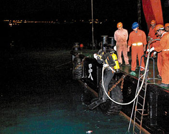 廣州打撈局的潛水員彭文科25日傍晚6時30分,緊接同事潛入海中探摸,10多分鐘后,對講機傳來看到“REST KICTEB AREA”的字母,沉船船長即表示彭文科已經(jīng)進入到甲板休息室。彭文科聽從指示,用攜帶的導引繩系在門扣上,然后浮上水面。