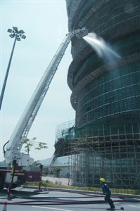 起火位置火勢一度猛烈,滾滾黑煙從地盤涌出街外,直卷半空,遠至立法會大樓也可清楚看見,狀甚嚇人。事發(fā)于16日下午1時許,大批消防員、救護員及治安警接報趕抵現(xiàn)場,消防員到場即在亞馬喇圓形地近舊澳氹大橋口升起云梯向著火的棚架及安全網(wǎng)射水撲救,防止火勢蔓延。