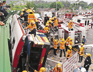 中新網(wǎng)5月6日電 據(jù)香港文匯報(bào)報(bào)道,上周四(5月1日)在香港西貢南邊圍回旋處釀成18死44傷的旅游巴翻側(cè)大車禍,一名于北區(qū)醫(yī)院留醫(yī)的45歲女傷者,經(jīng)5天搶救后延至5日終告?zhèn)夭恢,令大車禍死者增?9人。