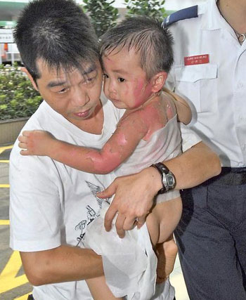 慘被熱湯灼傷的男童姓洪(譯音),1歲半大,與家人居于葵涌一單位,父母約30多歲。男童送院時(shí)在父親懷中不斷嚎哭,全身赤裸但敷上保護(hù)膜,其背部、左前臂及左臉頰全部紅腫,大幅表皮脫落,露出粉紅嫩肉,據(jù)悉約有三成半皮膚被灼傷,狀況令人慘不忍睹。