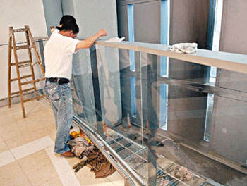 香港機場管理局早前聘請承辦商進(jìn)行防漏工程,工人需撬開大樓內(nèi)外的玻璃幕墻旁地板,再鋪以防漏漆,其中在大樓外的工程已大致完成,工人正展開樓內(nèi)工序。