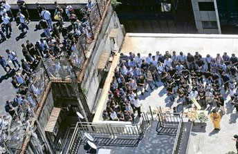 14日上午10時(shí),蕭永方的妻女及親友,連同陳兆龍的父母、好友及其它消防員戰(zhàn)友,約170人抵達(dá)災(zāi)場(chǎng)地下,親友及旺角消防局人員先登上嘉禾大廈天臺(tái),由于人數(shù)太多,部分人需站到相鄰的永如大廈天臺(tái)。