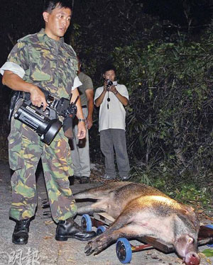 中新網(wǎng)9月19日電 據(jù)香港大公報(bào)報(bào)道,18日,一頭野豬闖入香港元朗牛潭尾民居,爆發(fā)“人豬大戰(zhàn)”。一頭重200斤的野豬進(jìn)村覓食時(shí)受驚,誤闖村屋空地,戶主及街坊等四人分持斧頭、犁耙合力捕捉,結(jié)果三人受傷,最后將野豬困鎖在廁所。警員接報(bào)趕至封鎖現(xiàn)場(chǎng),狩獵隊(duì)入村將野豬射殺。