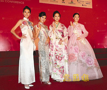 來(lái)自世界各地的63位佳麗身穿代表地區(qū)的民族服出場(chǎng),分組讓傳媒拍照。28日以身穿大露背晚裝的意大利小姐最為性感,去年的國(guó)際小姐冠軍墨西哥小姐28日也有出席記者會(huì),但卻失儀露底走光。