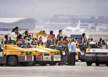 上月底,因?yàn)橘Y方停發(fā)“工作表現(xiàn)獎(jiǎng)”,機(jī)場地勤服務(wù)公司員工進(jìn)行歷時(shí)3小時(shí)的“警示式罷工”,半癱瘓機(jī)場6小時(shí);在香港勞工處斡旋下,勞資雙方5日進(jìn)行談判。
