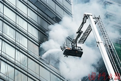 消防員接報到場時,起火樓層火勢異常猛烈,兩落地玻璃抵受不住熱力爆裂,碎片橫飛,火舌四射。消防員即進(jìn)入火場射水灌救,搜索被困工人,并升起云梯向起火房間的外部射水灌救。
