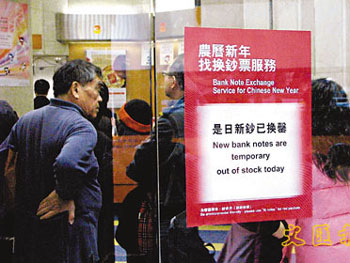 中新網(wǎng)1月14日電 據(jù)香港《文匯報》報道,春節(jié)將至,香港市民又要為換新鈔“封利是”張羅。每年春節(jié)前夕,相關(guān)單位都會加印鈔票供市民使用,香港銀行14日起為客戶提供新鈔兌換服務(wù),有新印及回收的新簇舊鈔兩款以供選擇,各面額鈔票的供應(yīng)量會與去年相若,料有3至4億張不同面值的新鈔供應(yīng)。