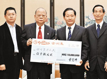 恒基兆業(yè)集團主席李兆基亦于14日委托次子李家誠送交由恒基兆業(yè)地產(chǎn)有限公司和中華煤氣公司捐贈的1000萬元賑災支票。