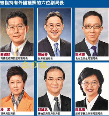 有傳媒28日引述“接近政府消息人士”稱,除候任商務(wù)及經(jīng)濟(jì)發(fā)展局副局長(zhǎng)蘇錦梁被指持有加拿大護(hù)照外,另有5名候任副局長(zhǎng)也被懷疑持有外國(guó)的居留權(quán),包括候任教育局副局長(zhǎng)陳維安、食物及衛(wèi)生局副局長(zhǎng)梁卓偉、環(huán)境局副局長(zhǎng)潘潔、運(yùn)輸及房屋局副局長(zhǎng)邱誠(chéng)武、財(cái)經(jīng)事務(wù)及庫(kù)務(wù)局副局長(zhǎng)梁鳳儀等,使事件更令人關(guān)注。