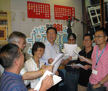 圖:馬時(shí)亨(中)客串電臺節(jié)目。(圖片來源:大公報(bào))