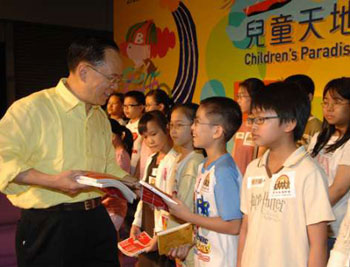 中新網(wǎng)7月28日電 據(jù)香港大公報(bào)報(bào)道,剛結(jié)束東北三省訪問(wèn)的行政長(zhǎng)官曾蔭權(quán),昨天與18名兒童一同到香港書(shū)展看書(shū),期間與他們暢談“開(kāi)卷之樂(lè)”。