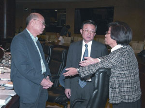圖:曹其真、徐偉坤、鄭志強(qiáng)交換意見。(圖片來源:澳門日報)