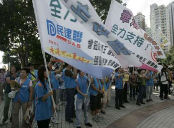 資料圖:九月香港立法會選舉七月十九日開始接受提名,選舉事務(wù)處總共接獲三十八份提名表格。圖為民建聯(lián)在長沙灣區(qū)舉行宣傳儀式,民建聯(lián)全部二十九位參選人聯(lián)同二百人助選團(tuán)出席報名儀式,為大家打氣加油。 中新社發(fā) 張勤 攝